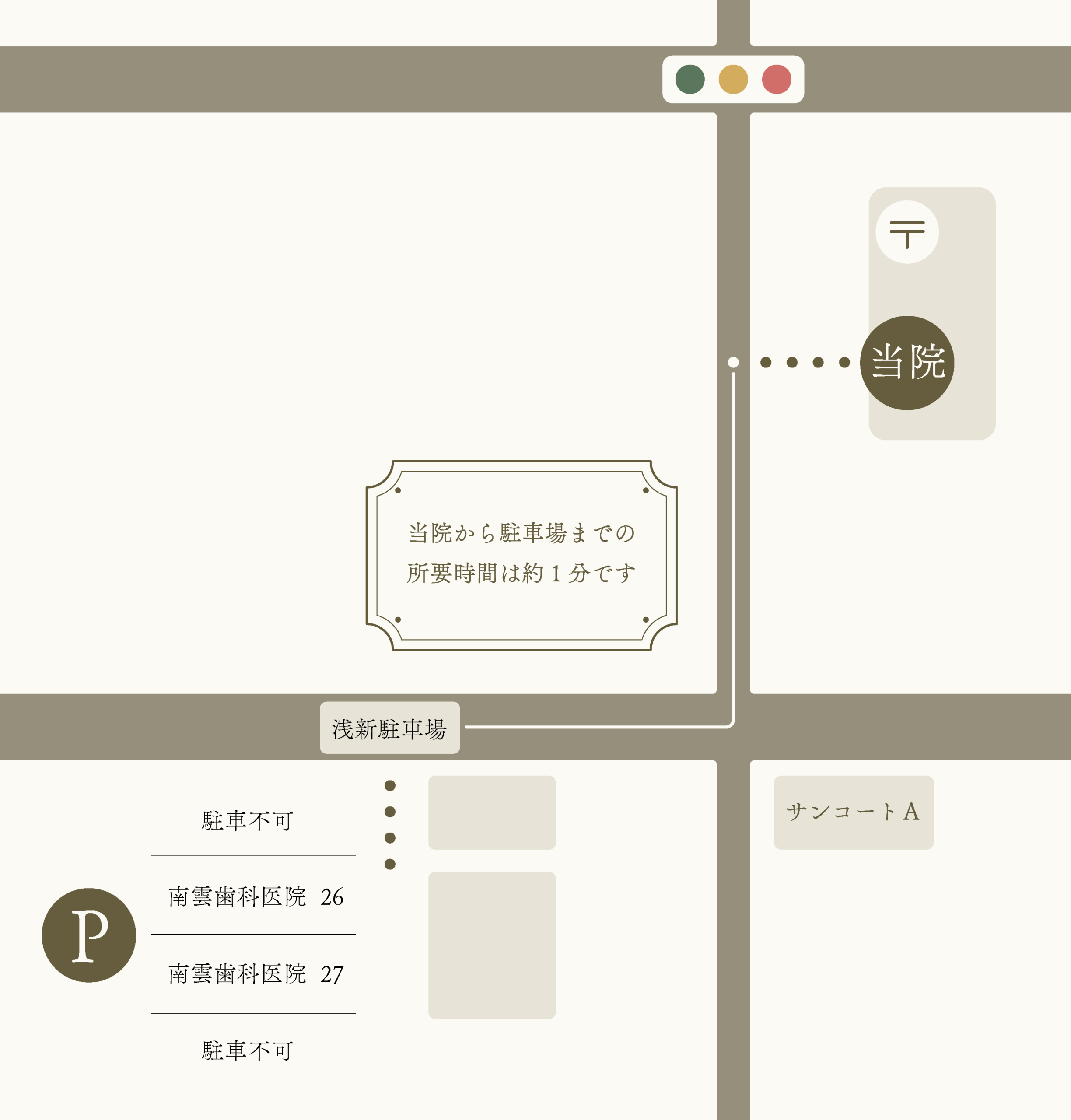 当院から約1分ほどの場所に2台分の駐車場(浅新駐車場)がございます。駐車番号26番または27番をご利用ください。